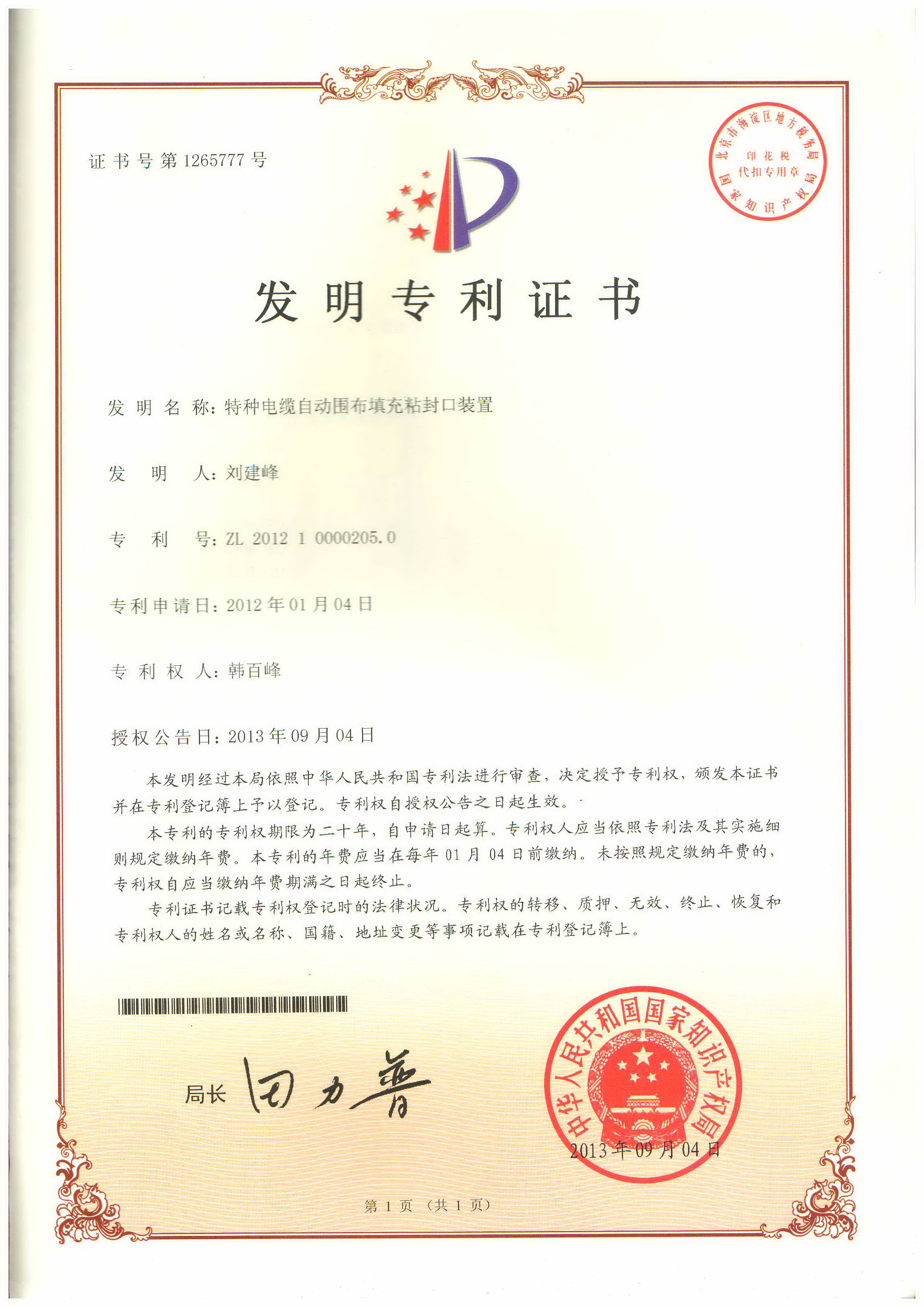 证书号第1265777号