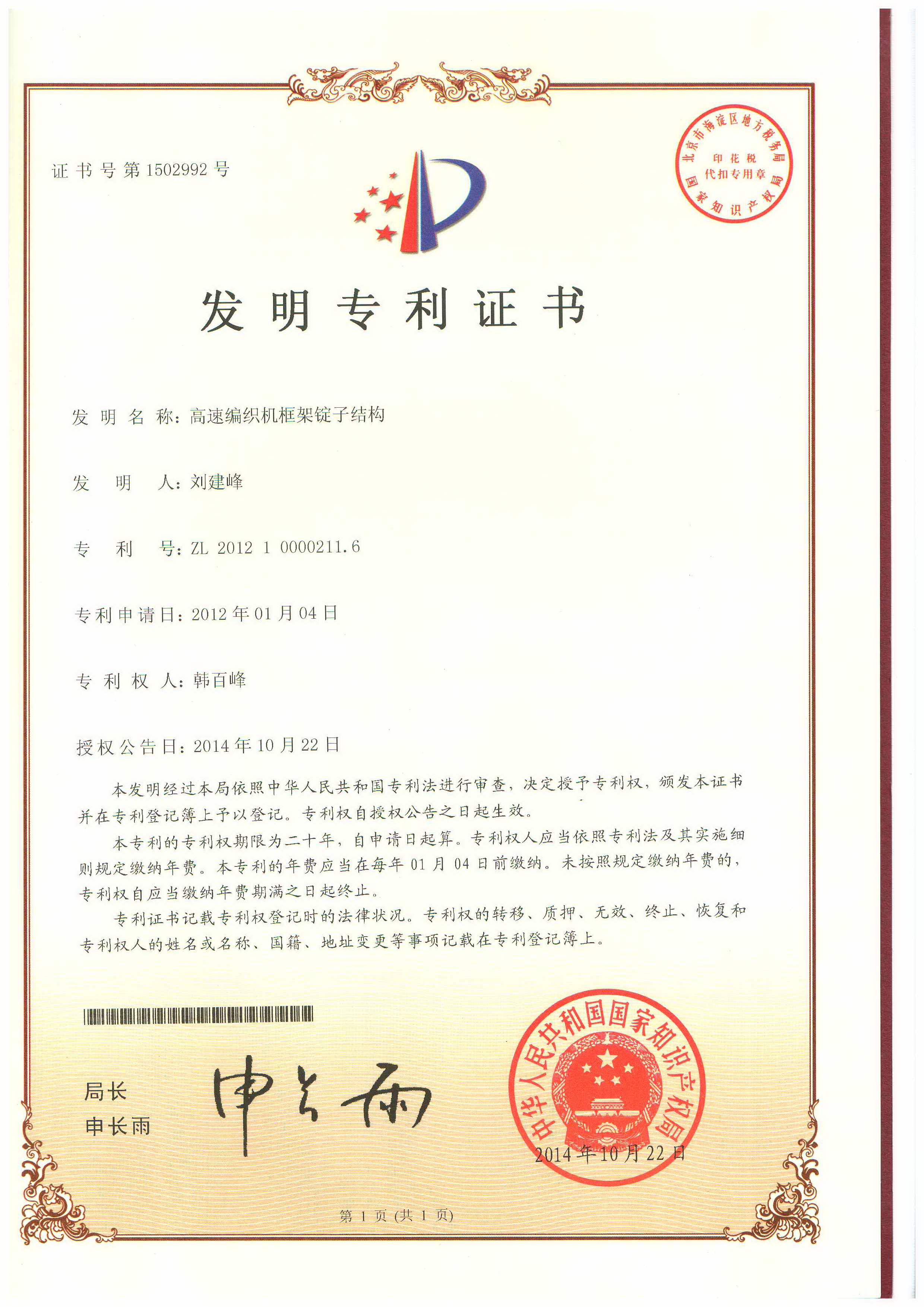 证书号第1502992号